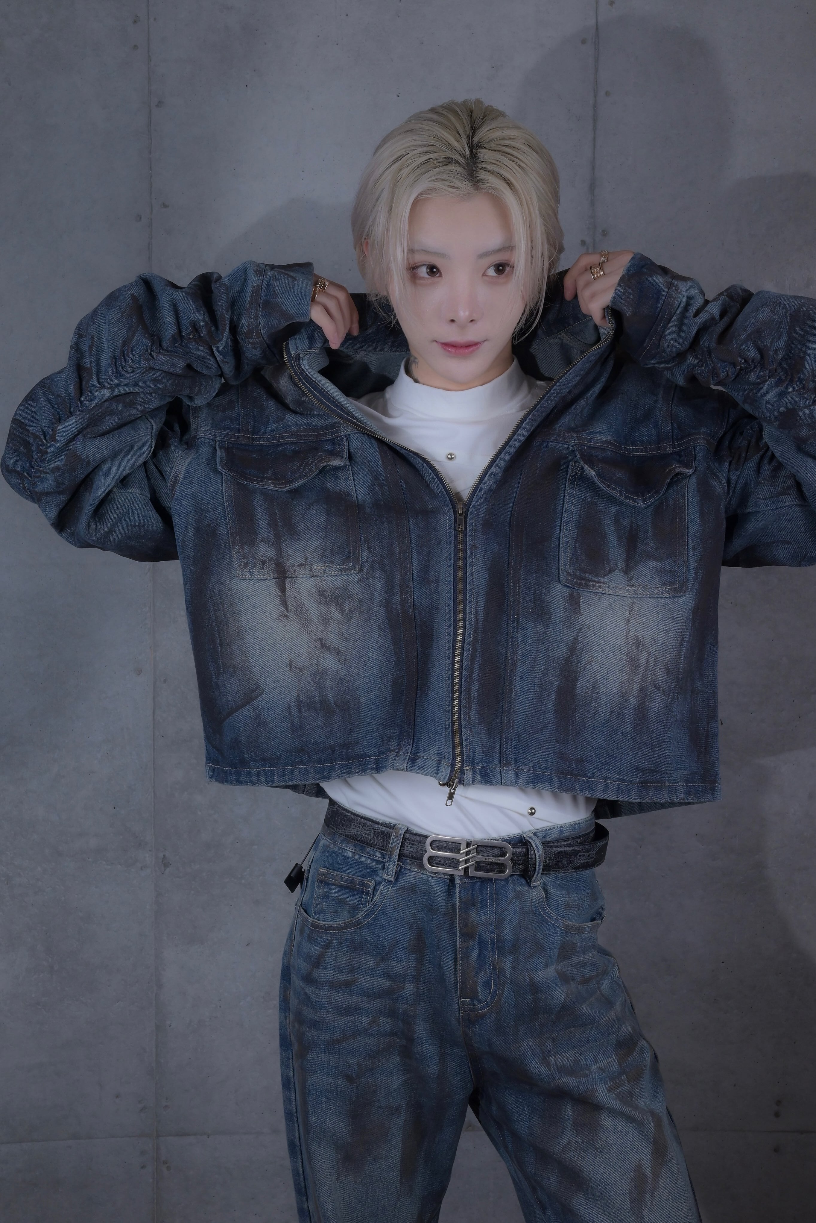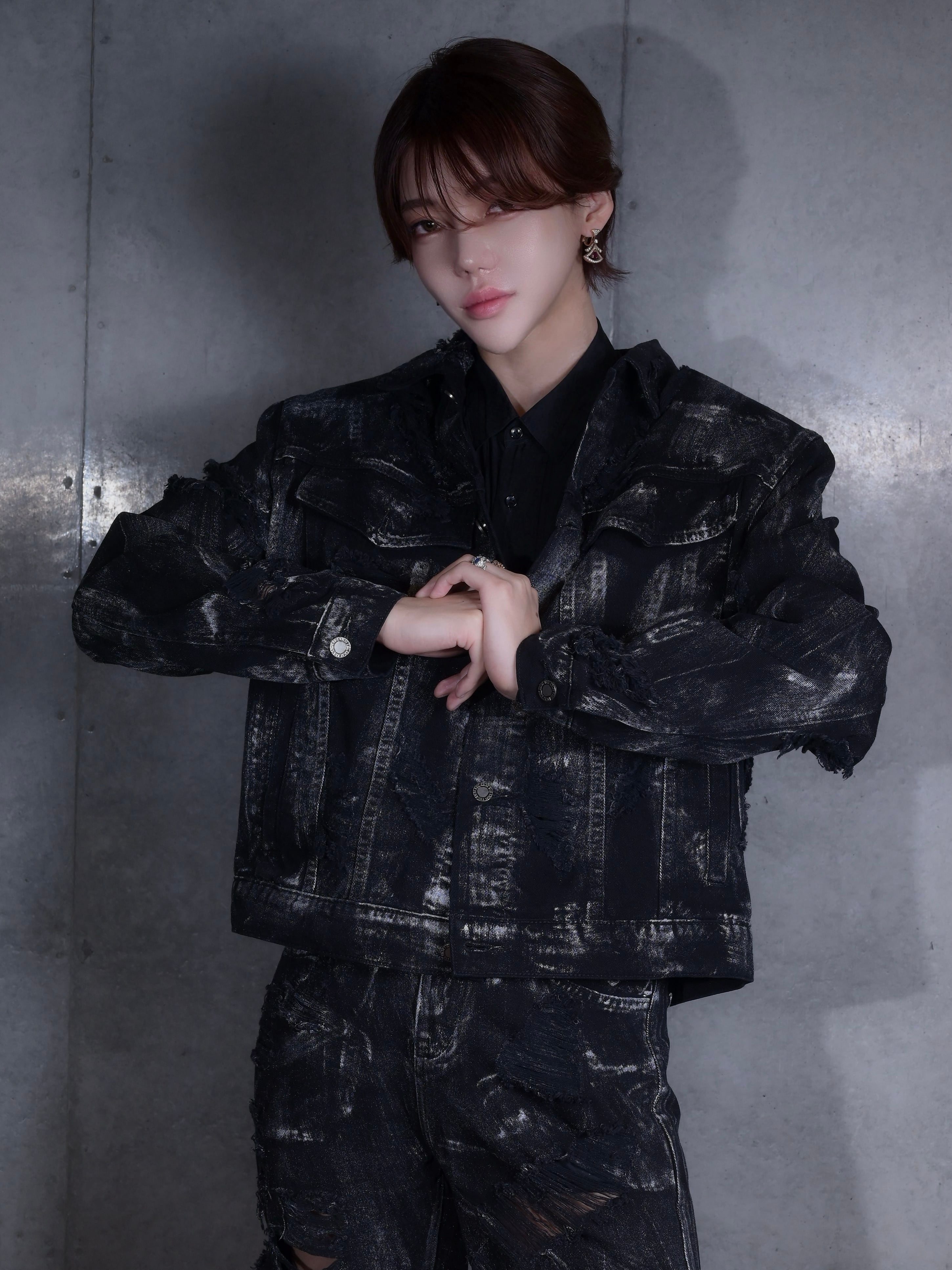 【九条音弥Nov.select items】ペイントクラッシュデニムジャケット 大胆なダメージと“擦れペイント”が存在感を放つモードデニムジャケットです。 ブラックに白のペイントタッチを重ねた、ヴィンテージ感と重厚さのある一枚。立体的なダメージ加工で、見る角度によって印象が変わる表情豊かなデザインとなっております。 インナー次第でハードにも上品にも寄せられる万能シルエット。単体使いはもちろん、セットアップでスタイルの完成度が一気に上がるアイテムでございます。 ※音弥さん着用サイズ:M 身長:180cm 体重:60kg