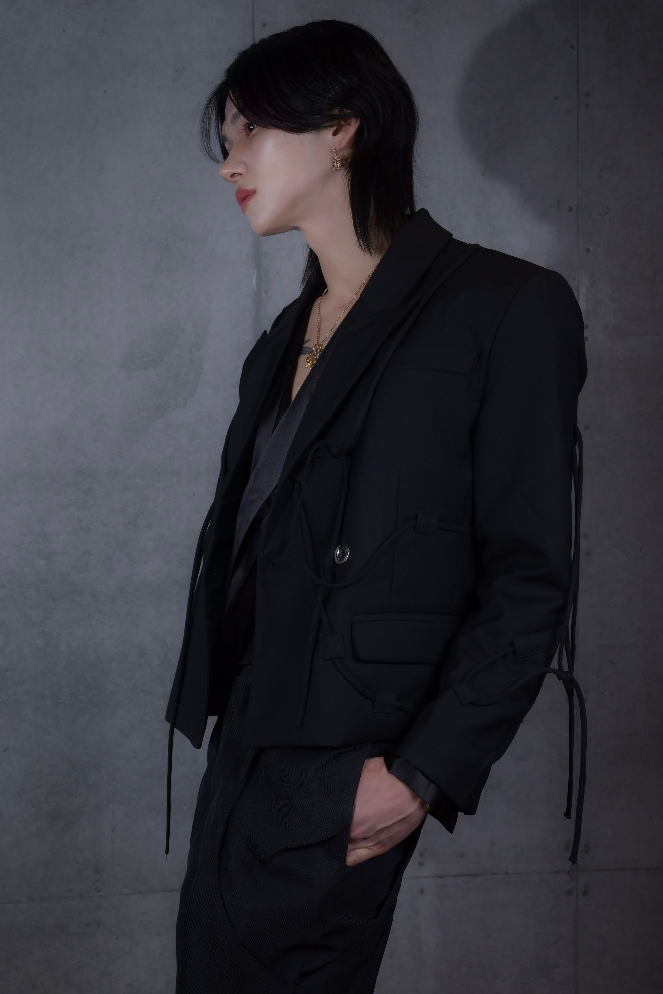 【真髄狐白 Selection Item SET】 狐白さんセレクトアイテムセットとなります。 スプラッシュ加工を施したテーラードジャケットに、シンプルなストレートラインのパンツを合わせました。 合わせのシャツにもメタルフリンジが施されていて、シンプルでも、しっかりと存在感の出るセットです◎ トータル10%のお値引きが入りますので、単品でのお求めより、大変お得です◎ ワンセットでトータルコーディネートもお手軽に叶いますし、それぞれ別々にもお使い頂くことが可能です。 ⚠️set販売はSサイズのお取り扱いはございません。ご了承くださいませ。 ※狐白さん着用サイズ: ジャケット、シャツ:Mサイズ パンツ:Sサイズ 身長:177cm 体重:60kg